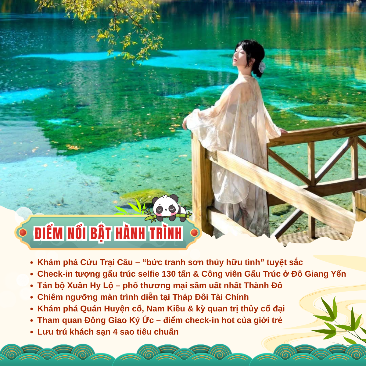 - Điểm đến: Thành Đô – Cửu Trại Câu – Công viên Gấu Trúc – Đô Giang Yển